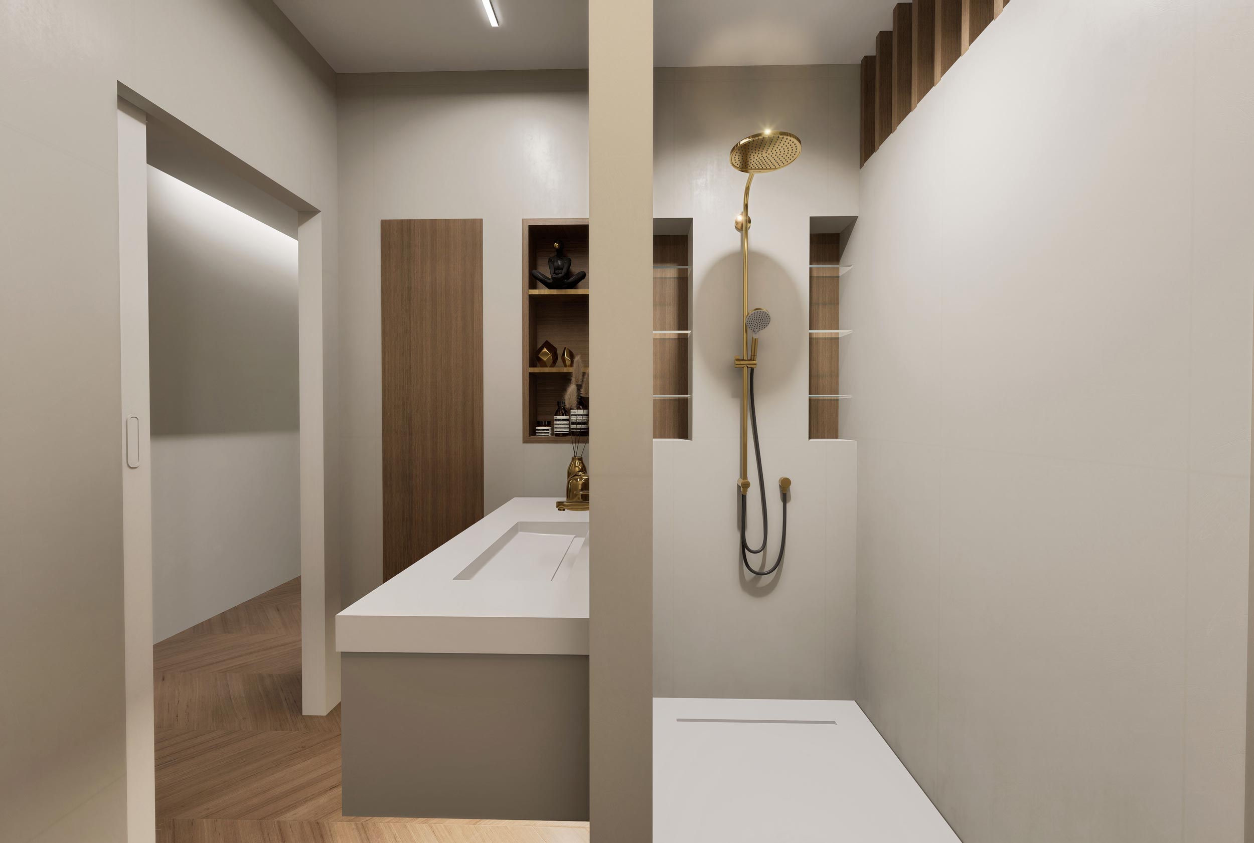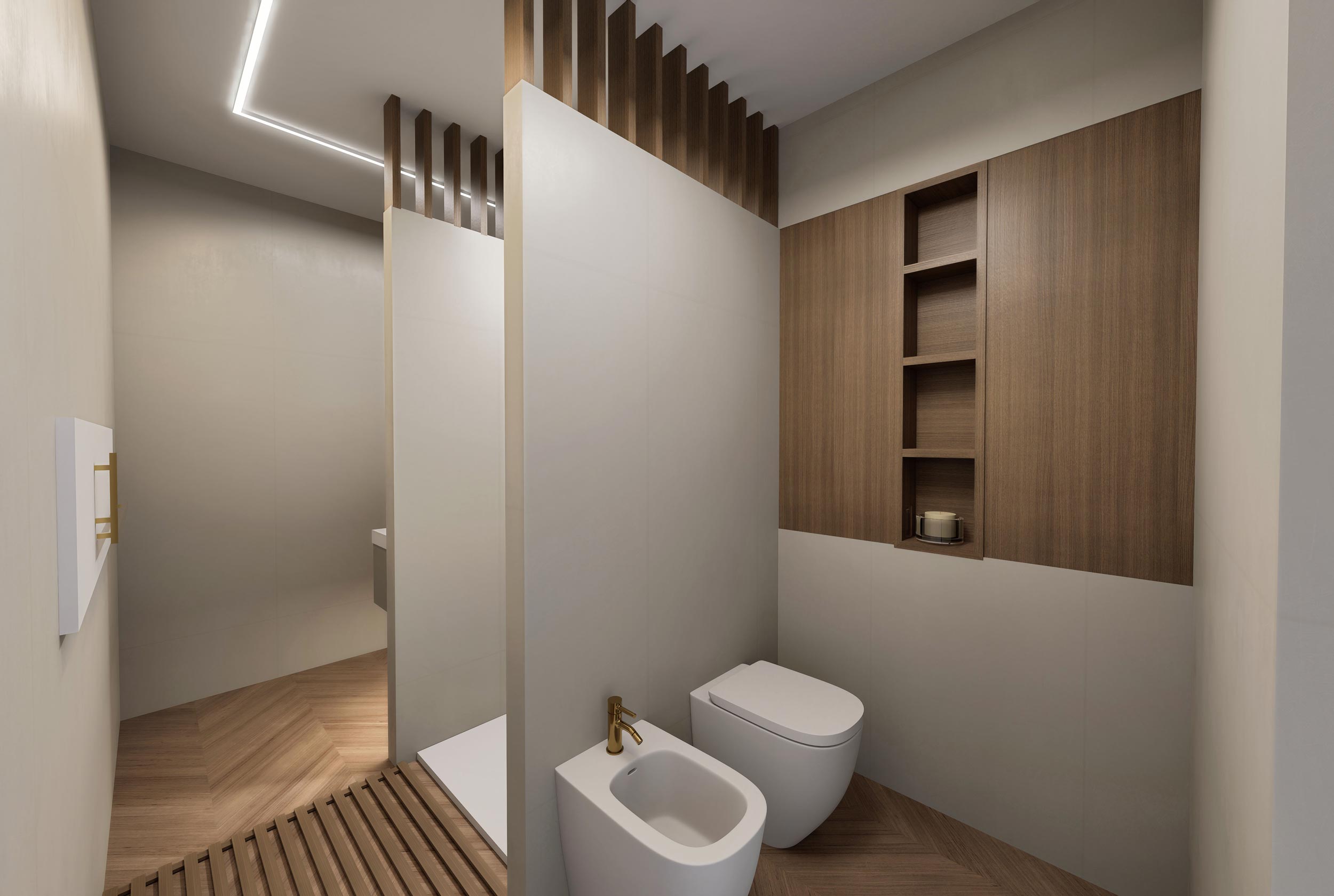 Un piccolo esempio di ottimizzazione degli spazi, il cliente non voleva rinunciare ad una doccia spaziosa ed avere comunque un ambiente che riuscisse a mantenere la privacy tra la zona lavabo e i servizi sanitari. Con questa soluzione abbiamo realizzando un ottimo disimpegno che da accesso diretto al lavabo, e conseguentemente una maggiore privacy per i servizi igienici che di fatto rimangono nascosti alla vista.